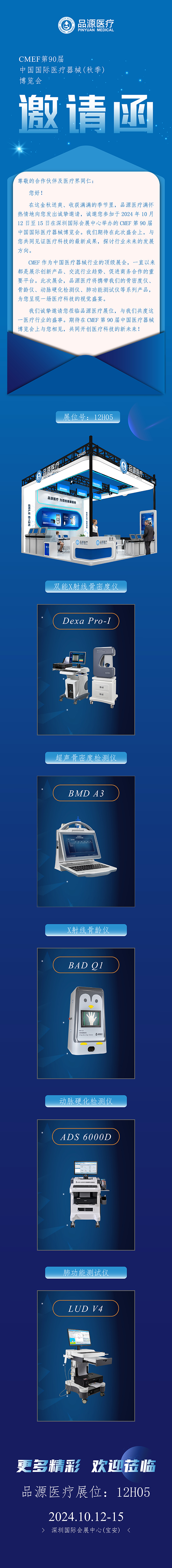 CMEF 作為中國醫療器械行業的頂級展會,一直以來都是展示創新產品、交流行業趨勢、促進商務合作的重要平臺。此次展會,品源醫療將攜帶我們的骨密度儀、骨齡儀、動脈硬化檢測儀、肺功能測試儀等系列產品,為您呈現一場醫療科技的視覺盛宴。我們誠摯邀請您蒞臨品源醫療展位12H05,與我們共度這一醫療行業的盛事。期待在 CMEF 第 90 屆中國醫療器械博覽會上與您相見,共同開創醫療科技的新未來!
