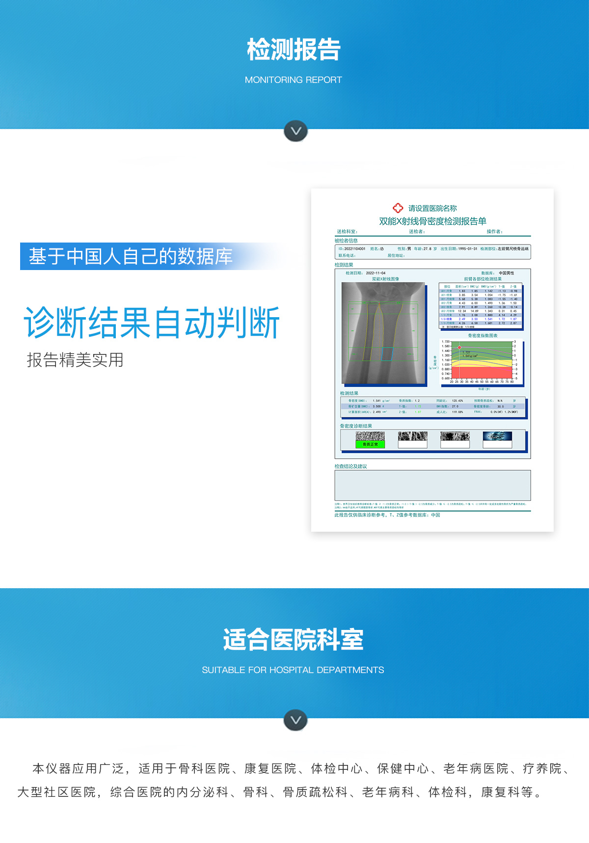 適用于骨科醫院、康復醫院、體檢中心、保健中心、老年病醫院、療養院、大型社區醫院,綜合醫院的內分泌科、骨科、骨質疏松科、老年病科、體檢科、康復科等。
